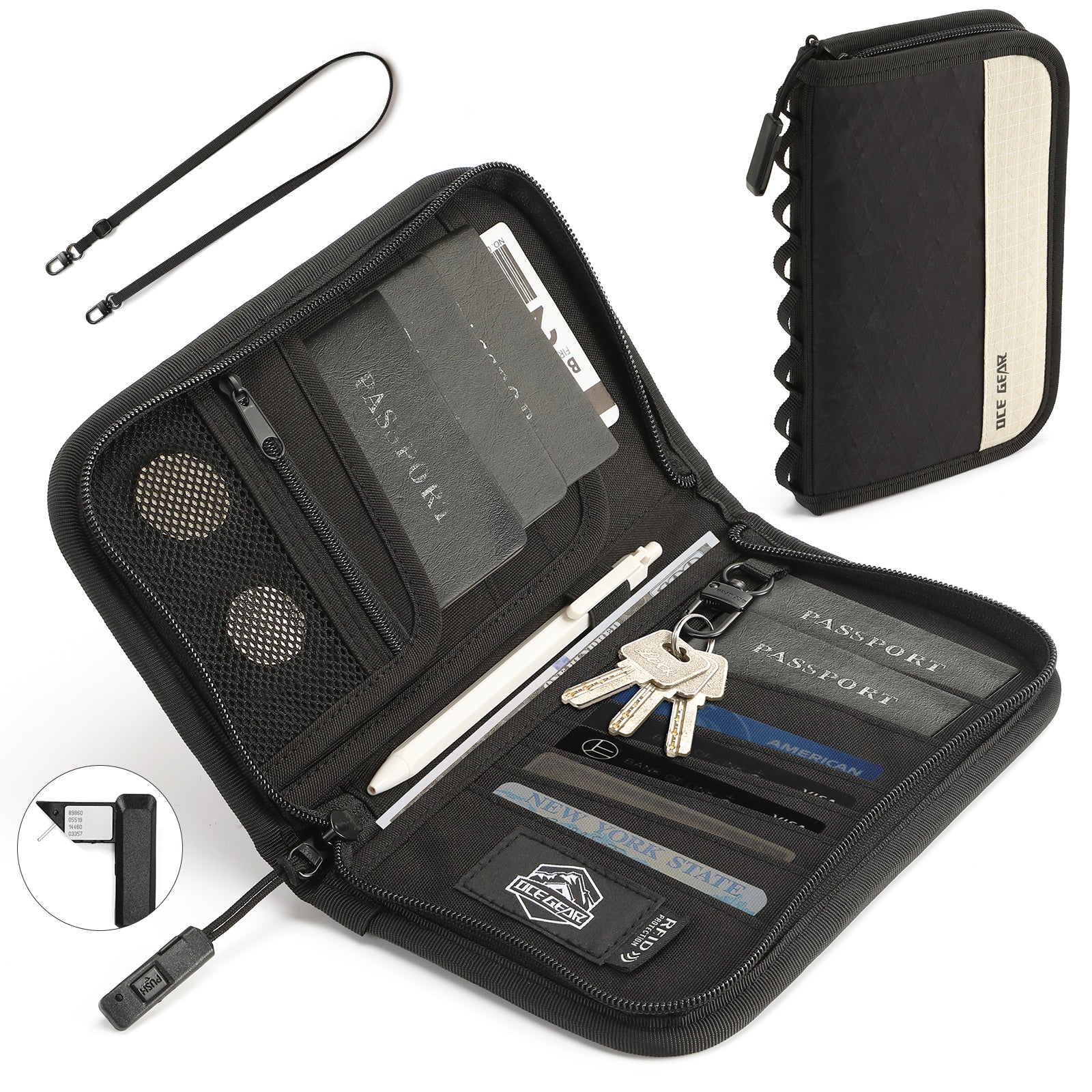 - 【Perfect Size for Travel】Size: (8.1" x 5.1" x 0.8"). The travel document organizer has space for up to 5 passports and tickets, 5-10 cards and checkbooks, pens, money, coins, keys. And comes with a detachable neck cord for easy carrying, perfect for carrying or storing in a bag/backpack/luggage.
